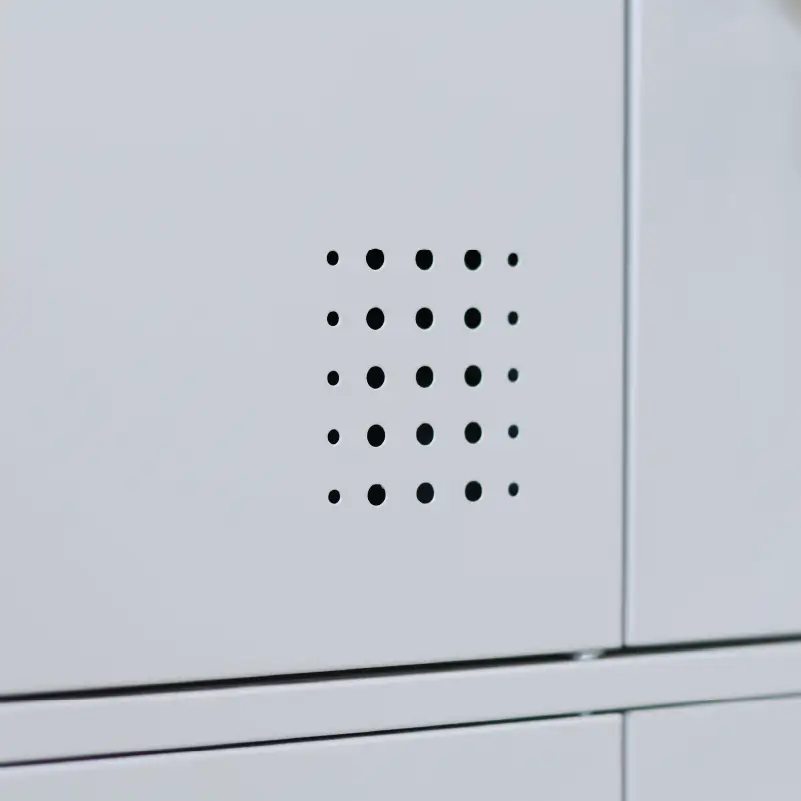 Cada puerta tiene cerradura independiente, ventilación por ranuras y manija embutida, garantizando comodidad y protección de los objetos personales.